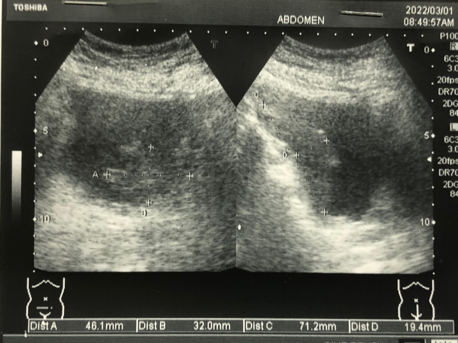 如圖,於超音波下明顯看到了膀胱裡有不規則腫瘤,